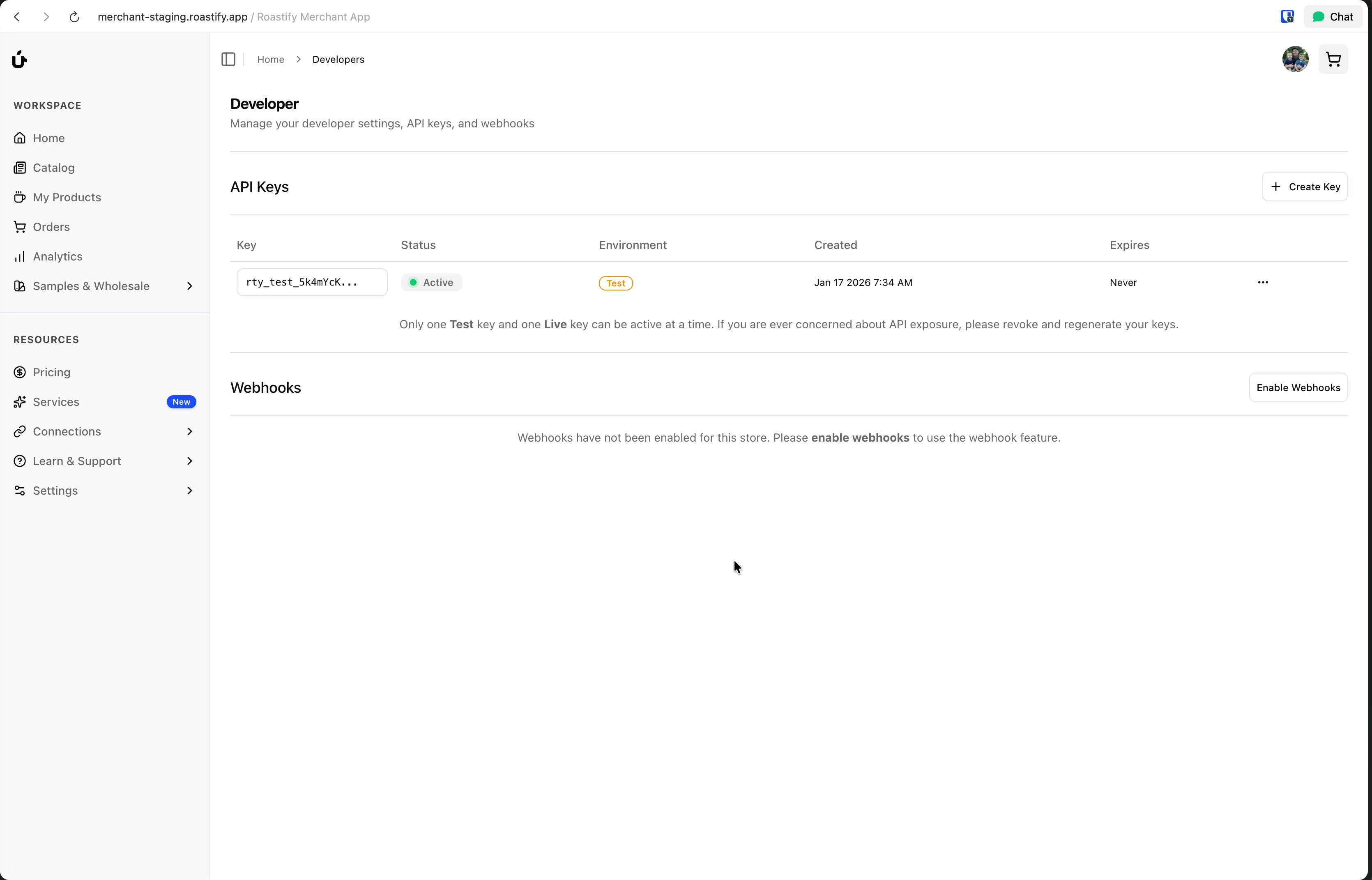 In the Webhooks section, click Enable Webhooks to activate the webhook feature.