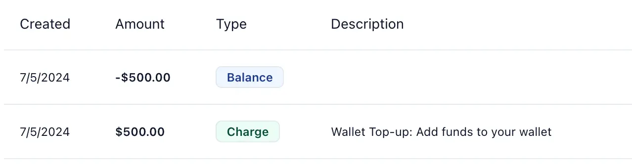 | Add Funds | Money added to wallet (shows as negative balance entry) |