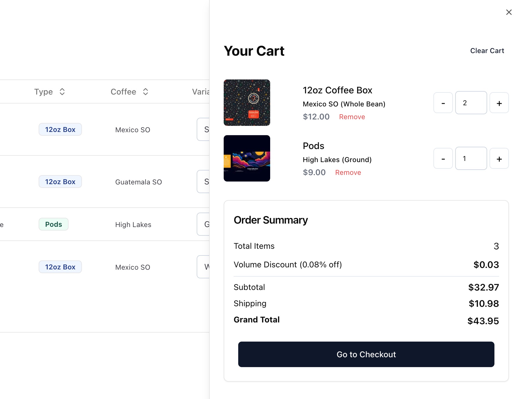 Review all items in your cart: - Verify quantities are correct - Check grind types are what you want - Make sure you didn't miss anything