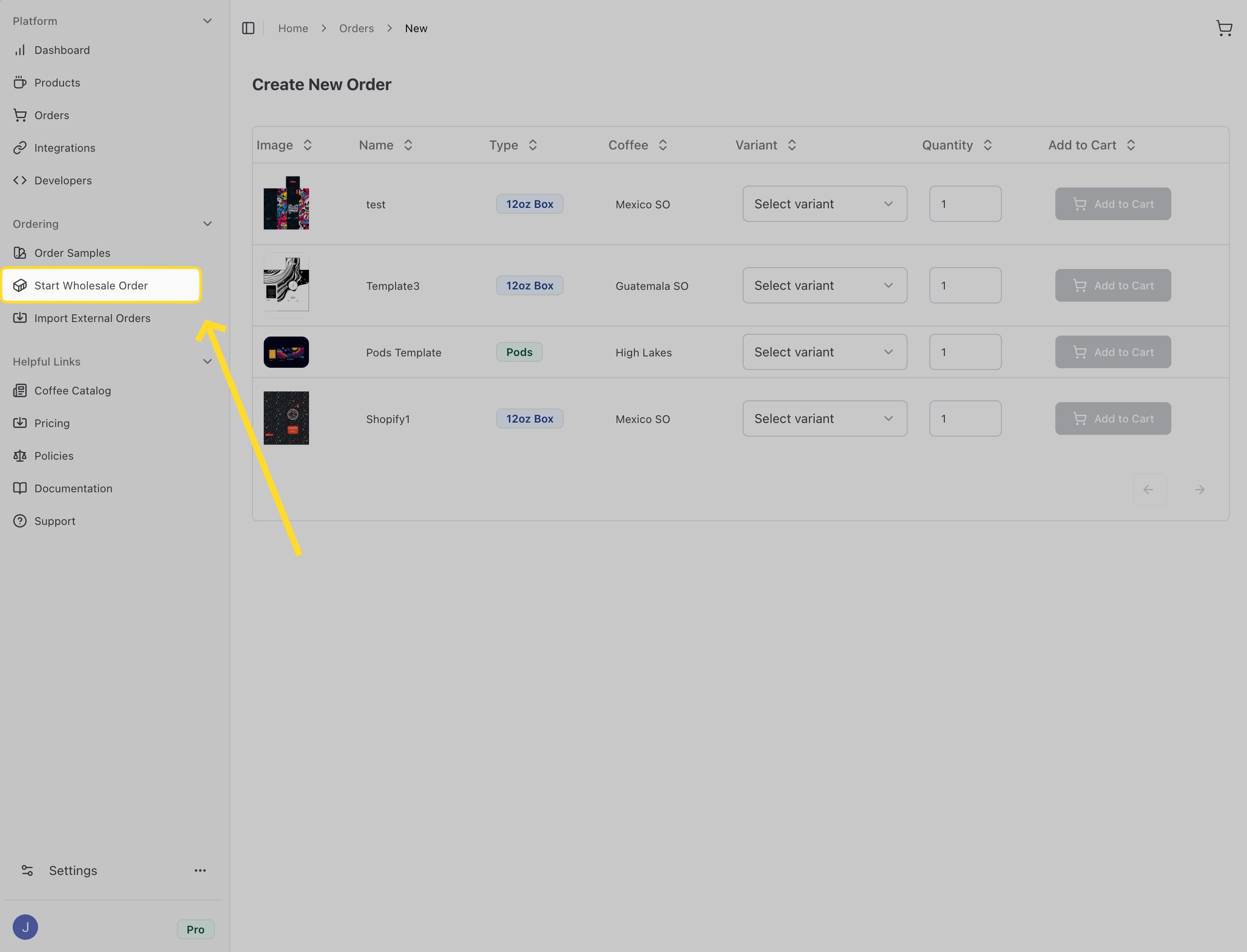 You can purchase wholesale products from any of your saved products. All orders are fulfilled directly by Roastify with fast turnaround times.